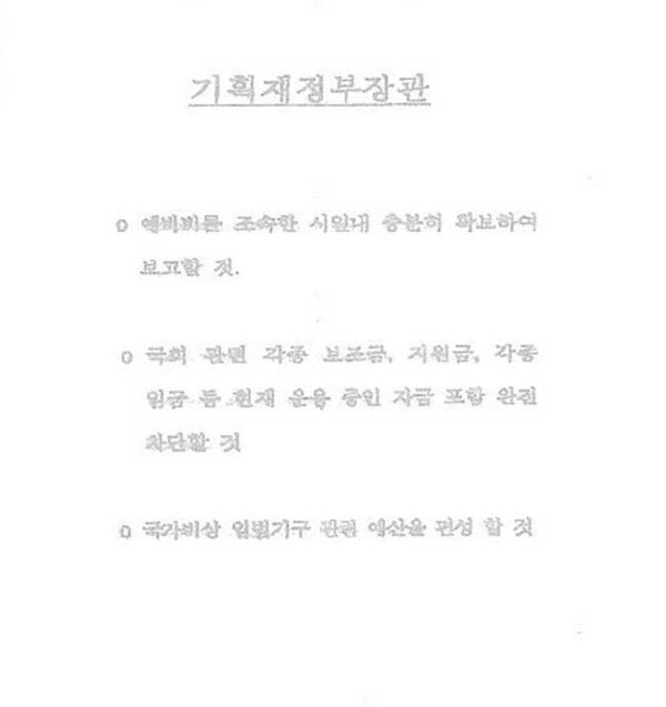한편 김 전 장관은 ‘최상목 문건’을 두고 장관끼리의 ‘협조 요청’이라고 축소했으나, 허위 증언일 가능성이 있다. 최상목 경제부총리·기획재정부 장관(현 대통령 권한대행)은 3일 계엄선포 직후 윤 대통령이 있는 자리에서 “자료”를 넘겨 받았고, 당시 윤 대통령에게 직접 “참고하라”는 취지의 말도 들었다고 국회와 검찰에 진술했다. 만약 김 전 장관이 해당 문건을 작성했다는 주장이 사실이라 해도, 윤 대통령의 승인이 있었음을 부인하기는 어렵다. 문건엔 “국가비상 입법기구 관련 예산을 편성할 것” 등 3가지 명령이 ‘지시’ 형태로 들어가 있어, 경제부총리에 단순 ‘협조 요청’을 구하는 내용으로 보기 어렵다.