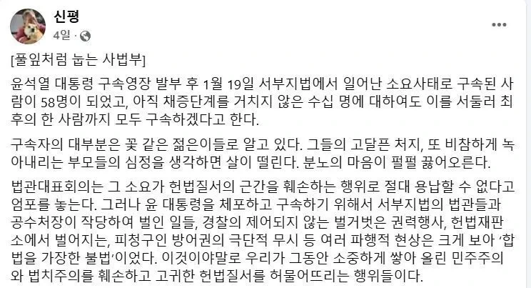 윤 대통령 멘토로 불리는 신 변호사는 지난 23일 자신의 페이스북에, 윤 대통령에게 구속영장을 발부한 차은경 서부지법 부장 판사를 두고 “매일 탄핵찬성집회에 참석한 열렬한 탄핵 지지자로 알려졌다”며 “차 판사는 자신의 정체를 몰래 숨기고 법을 위반하여 영장을 발부한 것”이라고 사실이 아닌 내용을 적었다.