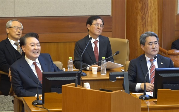 ▲내란 우두머리 혐의로 구속된 윤석열 대통령이 23일 오후 서울 종로구 헌법재판소에서 열린 탄핵심판 4차 변론에 직접 출석해 있다. ⓒ 헌법재판소 화면 캡춰
