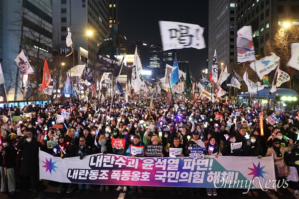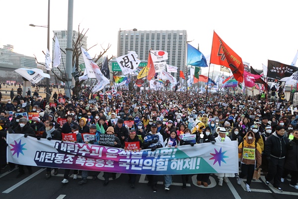 집회에 앞서 각양각색의 깃발을 든 채 모인 참석자들은 광화문에서 경복궁역 쪽으로 행진했고, 응원봉을 든 이들은 "퇴진 퇴진 윤석열 퇴진", "특검 특검 내란범 특검", "해체 해체 국힘당 해체"를 노래에 맞춰 외쳤다.