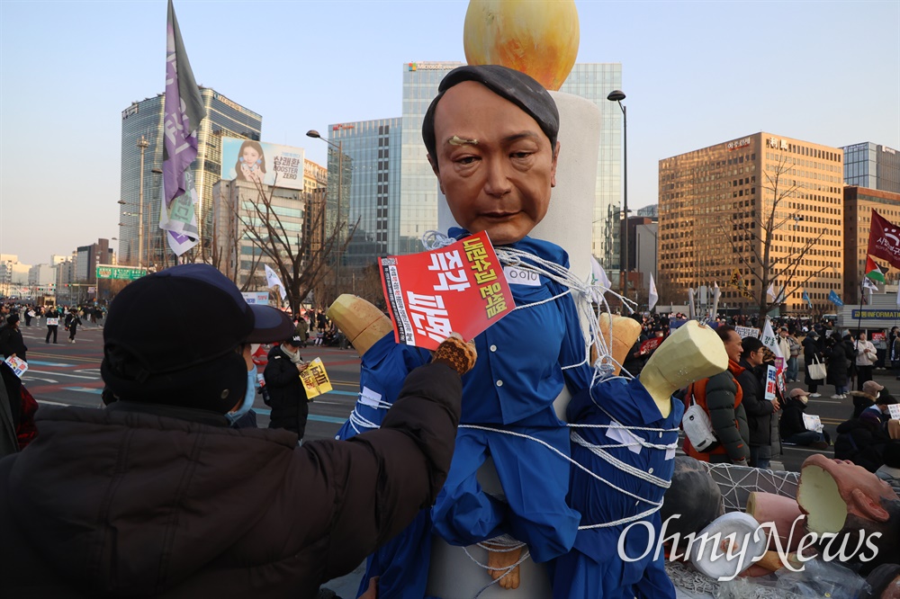 ▲윤석열즉각퇴진·사회대개혁비상행동이 1일 오후 서울 종로구 광화문 일대에서 연 9차 범시민대행진에서 수의를 입은 윤석열 대통령 인형이 등장했다. ⓒ 권우성관련사진보기