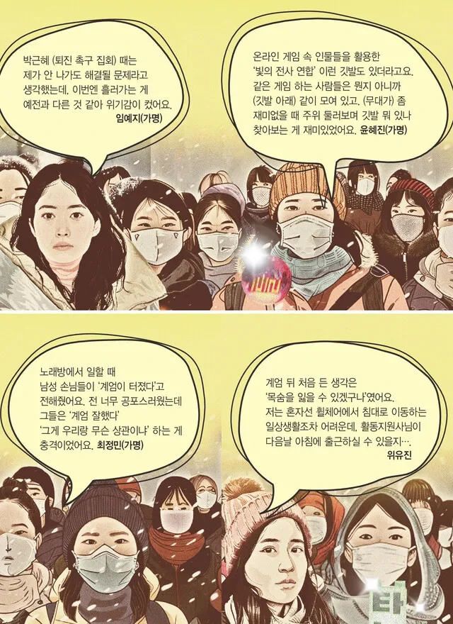 지난해 12월3일 밤 10시가 넘은 시각, 서울 강서구 집에서 초저녁잠을 자던 재수생 정서연(가명·20)을 두살 터울의 언니가 흔들어 깨웠다. 비상계엄? 가짜뉴스가 많은 시대니 거짓말인 줄 알았다. 카카오톡에 쌓인 “지금부터 못 나가는 건가?” “나가면 군인들이 있나?” 같은 친구들의 메시지에 점차 실감이 났다. 뉴스 화면엔 2005년에 태어난 서연이 영화에서만 보던 중무장한 군인들과 헬기가 있었다. “너무 혼란스럽고 내 삶이 어떻게 되는 건지 알 수 없어 두려웠어요.” 아무것도 하지 못한 채 국회 앞으로 달려나간 시민들이 계엄군을 막고, 계엄군이 시민들을 향해 총부리를 겨누고, 우여곡절 끝에 국회 본회의장에서 비상계엄 해제 요구 결의안이 통과되는 광경을 실시간으로 지켜봤다.