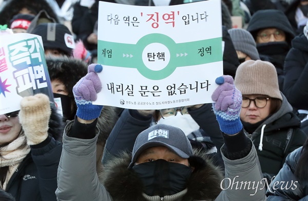 ▲'다음 역은 '징역'입니다, 내리실 문은 없습니다' 8일 오후 서울 광화문에서 열린 '윤석열 즉각 퇴진! 사회대개혁! 범시민대행진(10차)'에 참여한 시민들이 윤석열 파면을 요구하며 피켓을 들고 있다. ⓒ 남소연