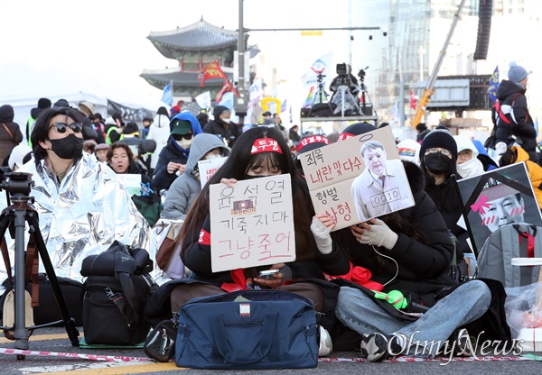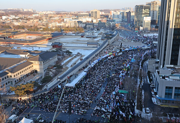 시민들의 분노는 8일 최저 기온 영하 13도의 혹한도 녹였다. 내란수괴 피의자인 대통령 윤석열이 헌법재판소 탄핵 변론에서 책임을 부하들에게 떠넘기는 파렴치한 모습이 달군 열기다. "윤석열 탄핵" 함성이 추운 거리에 울려퍼졌다.