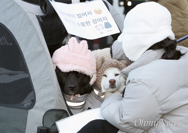 ▲'응원봉 만큼 소중한 둥이, 까미 왔어요'8일 오후 서울 광화문에서 열린 '윤석열 즉각 퇴진! 사회대개혁! 범시민대행진(10차)'에 참여한 한 시민이 '응원봉이 없어 데려온 소중한 강아지 둥이 까미랍니다'라고 써붙이고 반려견을 돌보고 있다. ⓒ 남소연