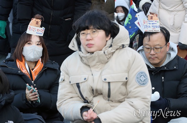 ▲최강 한파에도 광화문 아스팔트 위에 앉은 부부 8일 오후 서울 광화문에서 열린 '윤석열 즉각 퇴진! 사회대개혁! 범시민대행진(10차)'에 참여한 부부 김태희(오른쪽 뒤), 조현정(왼쪽 뒤)씨가 윤석열 파면을 요구하며 직접 만든 피켓을 머리띠에 붙이고 있다. ⓒ 남소연