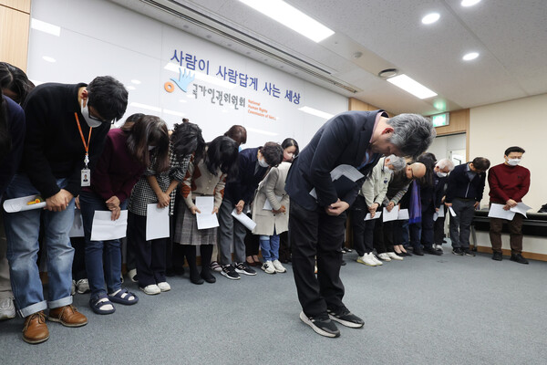 국가인권위원회 문정호 노조위원장 및 직원들이 11일 서울 중구 국가인권위원회에서 윤석열 대통령의 탄핵심판 방어권 보장 권고안 가결 규탄 호소문 발표에 앞서 국민을 향해 허리 숙여 사과하고 있다. 2025.2.11. 연합