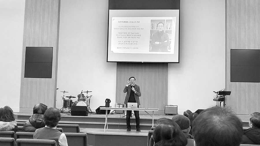 네 부문의 에피소드로 나눠 진행한 정 교수는 “을사늑약 120년과 남북 분단 80년이 되는 올해 우리는 격랑,격동의 시간인 용과 뱀 사이 ‘이무기의 시간’을 지나고 있다”고 의미있는 풀이로 강연을 시작하며 “이스라엘-하마스와 우크라이나-러시아 전쟁 등 세계는 증오와 분노에서 비롯된 참혹한 전쟁의 와중에 있고 남과 북은 단절의 아픔이 심화되고 있다”면서 “전쟁은 모든 것을 파괴하고 인간성을 말살한다. 한반도에서도 또다시 전쟁이 있어서는 절대 안된다”고 역설했다. 그는 이어 “이스라엘이 블레셋과 대적할 때 아브라함이 적군인 블레셋을 위해 중보기도하여 전쟁이 끝난 것처럼, 우리 한국교회도 저주가 아닌 적을 향해 하나님 뜻에 합한 기도를, 북한을 위해 기도해야 할 때”라고 말했다.