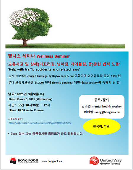 홍푹 정신건강협회는 교통사고 및 각종 상해 사건과 관련된 법적 대응 방법을 안내하는 온라인 웰니스 세미나를 3월5일(수) 오전 10시30분부터 12시까지 개최한다.