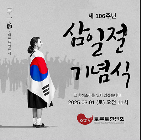 일제치하 자주독립을 외친 3.1 독립혁명 및 임시정부 수립 제106주년 기념식이 3월1일(토) 오전 11시 토론토 한인회관(1133 Leslie St., North York)에서 열린다.
