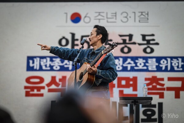 다음은 가수 강산에의 '깨어나'와 '넌 할 수 있어' 공연이 있었다. 강산에 씨는 "함께 연대할 수 있어서 감사하다"며 "12월 3일 그날 밤 소식을 듣고 국회로 달려가 주신 시민과 의원, 국회 당직자, 보좌관 등 수많은 여러분에게 감사드린다"고 전했다.
