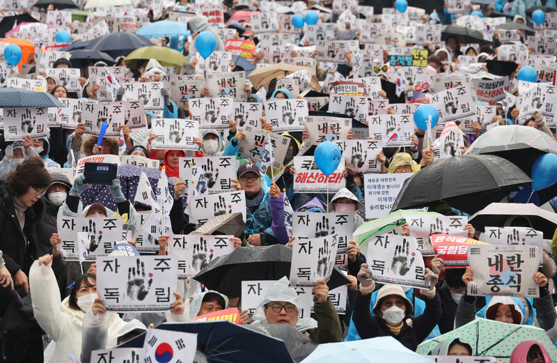 스스로를 30대 백수라고 소개한 박혜림씨는 “법을 저보다 훨씬 배운 사람들에게 헌법대로 국정 운영하라는 말이 이렇게 어렵게 들릴지 몰랐다”며 “윤석열이 홧김에 내린 계엄으로 1919년부터 쌓아온 이 사회의 상식이 난도질 당했다. 이제 대한민국은 최소한의 상식조차 통하지 않는 나라”라고 분노했다. 이화여대 학생 장은아씨는 “이화여대에선 반페미니스트를 자칭하는 극우세력이 캠퍼스에 침입해 피켓을 부수고 학우를 밀치고 멱살까지 잡는 횡포를 부렸다”며 “저들이 주장하는 자유민주주의는 그런 것이다. 혐오와 반민주적 선동”이라고 말했다.