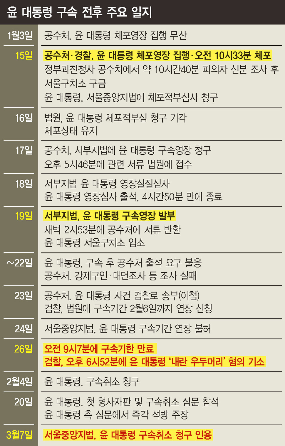 서울중앙지법 형사합의25부(재판장 지귀연)는 7일 윤석열 대통령의 구속을 취소하면서 우선 구속기간이 지난 뒤의 기소라는 윤 대통령 쪽의 주장을 받아들였다.