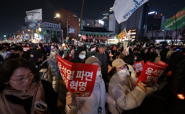 8일 서울 종로구 종로1가 교차로 일대에서 윤석열 대통령 파면 촉구 범국민대회를 마친 시민과 참가자들이 행진을 하고 있다. 2025.3.8. 연합
