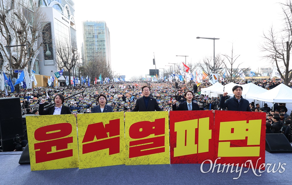 이재명 더불어민주당 대표를 포함 야 5당 대표들은 "윤석열은 끝내 파면될 것"이라며 "내란이 종식될 때까지 국민의 손을 놓지 않고 끝까지 함께 싸우겠다"고 강조했다.