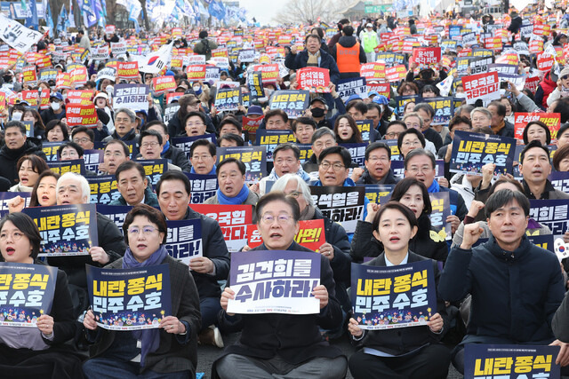 야권은 한목소리로 헌법재판소의 빠른 파면 결정을 촉구했다. 조 수석대변인은 “내란 수괴에 대한 신속한 파면만이 헌정 질서를 지킬 수 있는 유일한 길”이라며 “하루라도 빠른 파면 결정으로 국민의 불안과 사회적 혼란을 차단해주시라”고 했다. 김 수석대변인도 “내란 수괴의 구치소 밖 나들이를 하루라도 빨리 끝내야 한다. 시간이 없다”고 말했다. < 엄지원 기자 >
