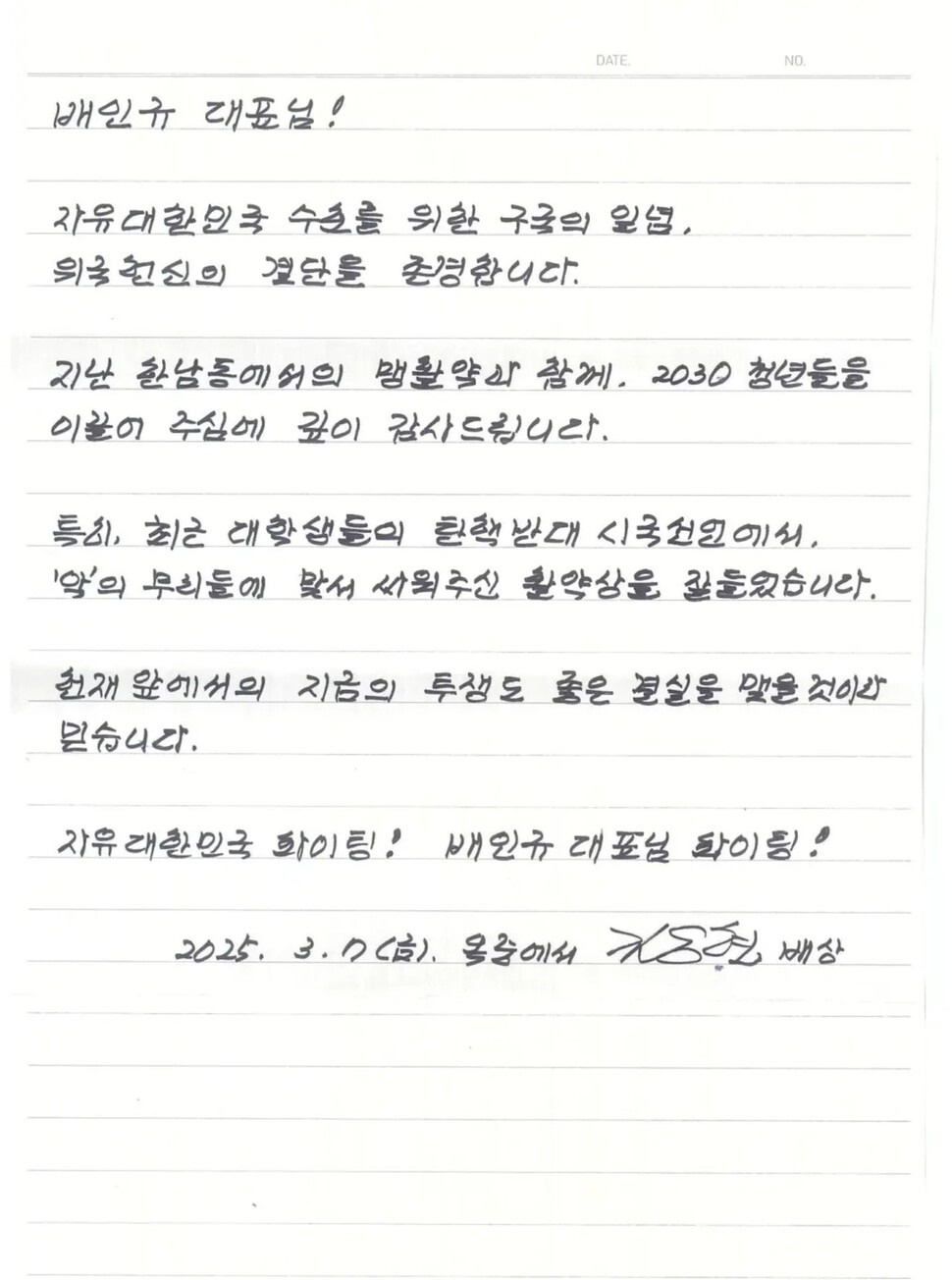 반여성주의를 앞세운 ‘신남성연대’의 배인규 대표는 8일 김 전 장관이 자신 앞으로 보낸 옥중 편지를 공개했다. 전날 작성된 것으로 보이는 김 전 장관의 편지를 보면, 김 전 장관은 “자유대한민국의 수호를 위한 구국의 일념, 위국헌신의 결단을 존중한다”며 “지난 한남동에서의 맹활약과 함께 2030 청년들을 이끌어주심에 깊이 감사드린다”고 적었다. 이어 “특히 최근 대학생들의 탄핵반대 시국선언에서 ‘악’의 무리들에 맞서 싸워주신 활약상을 잘 들었다”고 덧붙였다.