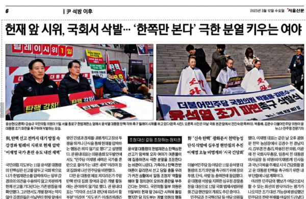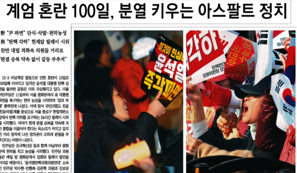 “계엄 혼란 100일, 분열 키우는 아스팔트 정치”(동아일보)/ “국회대신 거리로...윤 석방에 극렬해진 ‘지지층 결집’ 정치”(한국일보)/ “헌재 앞 시위, 국회서 삭발...‘한쪽만 본다’ 극한 분열 키우는 여야”(서울신문)/ “거리로 나간 야당, 각자에 맡긴 여당”(중앙일보)