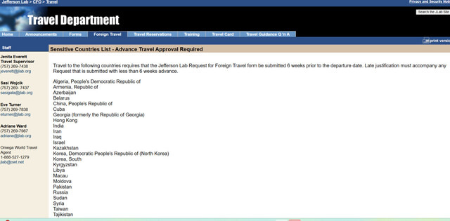 미국 에너지부 산하 17개 국립연구소 가운데 하나인 ‘제퍼슨랩’(토머스 재퍼슨 국립 가속기 연구소) 누리집에는 연구소 방문 6주 전 반드시 승인을 받아야 하는 민감국가 명단에 한국이 북한 등과 나란히 올라있다. 한겨레는 앞서 다른 국립연구소에도 한국이 포함된 민감국가 명단이 ‘2025년 4월15일부터 적용된다’고 명시된 공문이 전달된 걸 확인한 바 있다. 에너지부의 민감국가 명단이 공식적으로는 발표되지 않고, 내부 규정 등으로 적용된다는 점을 고려하면 상당수 연구소에서 비슷한 조치가 취해지고 있는 것으로 추정된다.