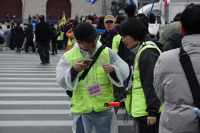 시민이 노래에 맞춰 ‘윤석열 탄핵’을 외치기까지, 활동가와 자원봉사자의 숱한 손길이 필요하다. 비상행동 상황실 활동가 99명과 자원봉사자 150여명이 집회를 준비하려 종일 분투한다. 집회가 있는 날이면 아침 10시부터 회의를 열고 시시각각 바뀌는 정치 상황에 맞게 집회 주요 기조를 정한다. 낮에는 각 단체가 여는 사전집회를 지원한다. 오후 3시께부터 본 집회를 위한 무대, 음향, 조명을 체크한다.