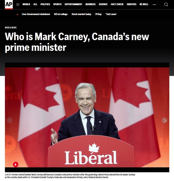 ▲마크 카니 캐나다 신임 총리 취임을 보도하는 AP통신