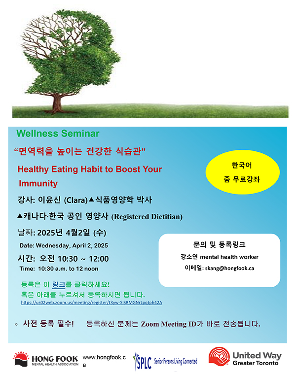 홍푹 정신건강협회는 “면역력을 높이는 건강한 식습관”(Healthy Eating Habit to Boost Your Immunity) 주제의 온라인 무료 웰니스 세미나를 4월 2일(수) 오전 10시30분부터 12시까지 개최한다.