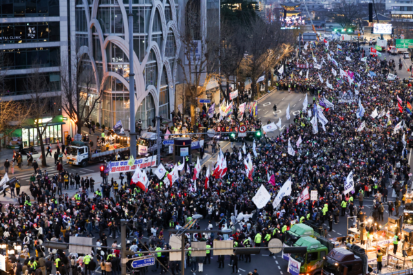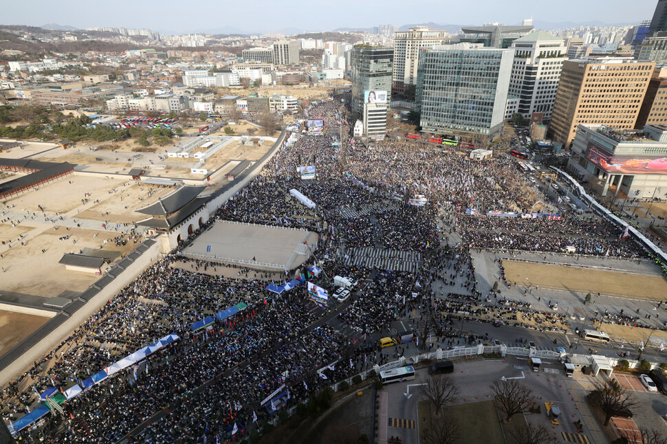 서울 경복궁 일대가 윤석열 대통령의 조속한 파면을 촉구하는 시민들로 가득 찼다. 15일 오후 서울 종로구 경복궁역 사거리부터 안국동 사거리까지 1킬로미터가 넘는 10차선 도로가 인산인해였다.