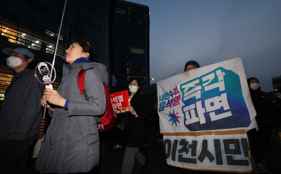 시민들은 '내란수괴 윤석열을 즉각 파면하라', '내란종식 민주수호', '내란동조 국민의힘 해체하라', '윤석열 파면처벌'이라고 쓰인 피켓을 들고 헌법재판소가 있는 안국동 방향으로 행진했다. 다음 주 헌재의 윤 대통령 탄핵심판 선고가 예상되면서 응원봉을 든 시민들이 다시금 광장에 모인 것이다.