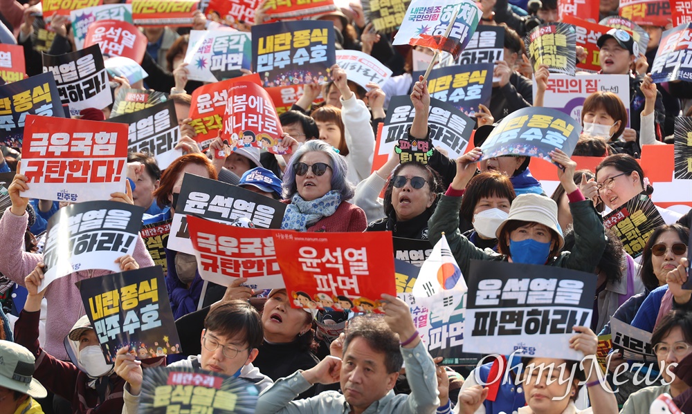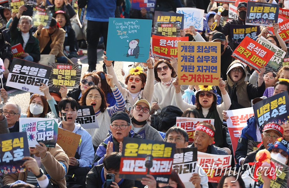 헌법재판소가 최재해 감사원장 등의 탄핵소추를 기각하고 윤석열 탄핵심판 선고가 늦춰지고 있는 가운데 '윤석열 파면' 피켓을 든 시민과 야당 국회의원들은 안국동사거리와 광화문 일대에 모여 행진을 하면서 "반드시 윤석열 파면시키자"고 결의를 다졌다.