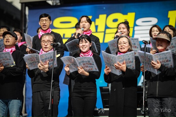 마지막으로 '촛불합창단'은 <촛불의 나라> <촛불같은 사람들>을 합창했다. 이들은 '내란수괴 윤석열을 파면하라!' '국힘당을 해산하라' '내란 세력 단죄하라'라고 쓰여 있는 악보집을 들고 있었다. 한국대학생진보연합 노래단 '빛나는 청춘'과 노래패 '우리나라'는 함께 <우리가 바라는 대로> <주권자의 노래>를 불렀다.