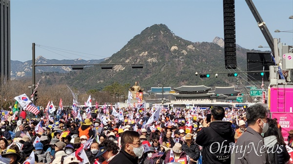이날 탄핵 반대 집회 참가자는 광화문광장 일부와 동화면세점부터 시청 앞까지 이르는 8차선 도로에 가득 들어찼다. 이들은 대부분 70대 이상 노년층으로 보였다. 전국 각지에서 올라온 전세버스는 시청역 주변 곳곳에 섰다 떠났다를 반복했다.