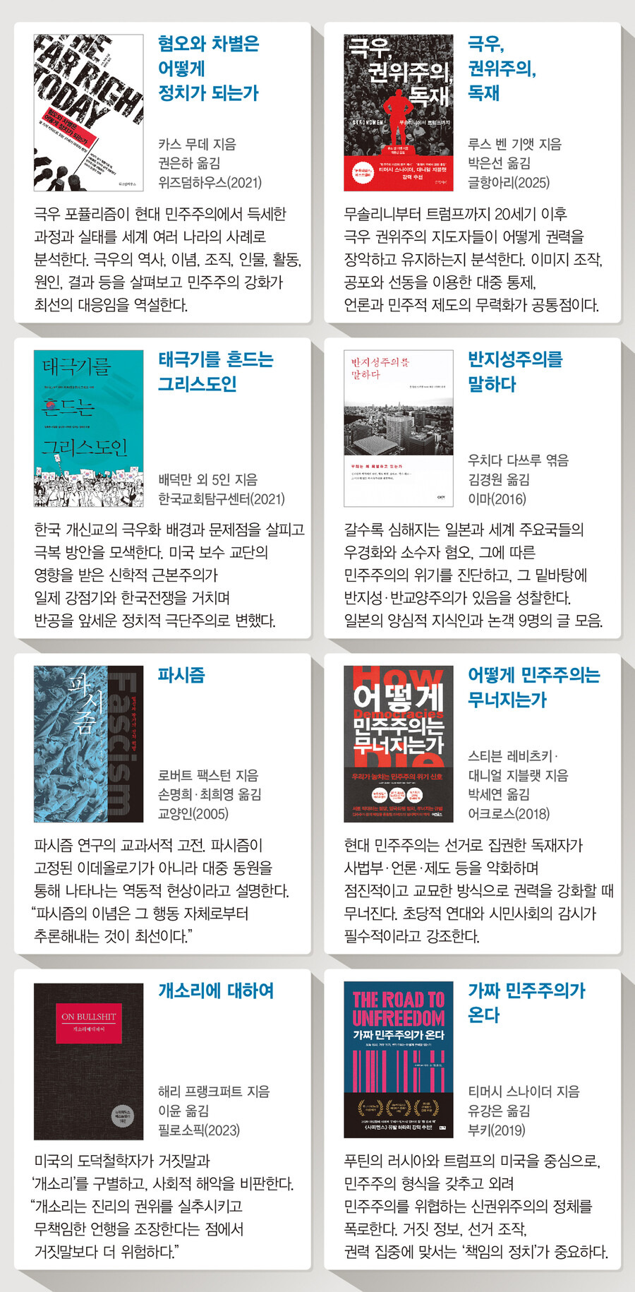 “극단 우익은 민주주의의 본질인 국민 주권과 다수 통치를 거부한다. 대표적 예가 히틀러와 무솔리니에게 권력을 쥐여준 파시즘이다.” ―‘혐오와 차별은 어떻게 정치가 되는가’