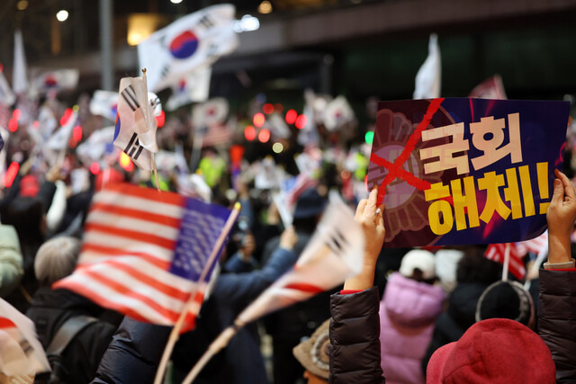 ‘한국의 극우’가 누구인지를 규명하는 일은 ‘극우’를 정의하는 일에서 시작할 수밖에 없다. 가장 널리 인용되는 정의가 미국의 극우 연구자 카스 무데의 것이다. 그는 극우의 특징으로 반민주주의, 권위주의 국가관, 외국인 혐오, 인종주의, 배타적 민족주의를 추출해냈는데, 그중에서도 ‘반민주주의’를 가장 중요한 성분으로 꼽았다. 이렇게 본다면 ‘한국 극우’는 ‘12·3 계엄에 대한 지지 여부’로 판별하는 게 합리적이다. 12·3 비상계엄이야말로 ‘반민주주의’(군을 동원한 헌정질서의 중단)와 ‘권위주의 국가관’(“계엄은 정당한 통치권 행사”)과 ‘외국인 혐오’(“중국 간첩의 국정 교란”) 같은 극우의 핵심 성분을 ‘명분과 행동’ 안에 모두 갖추고 있기 때문이다.