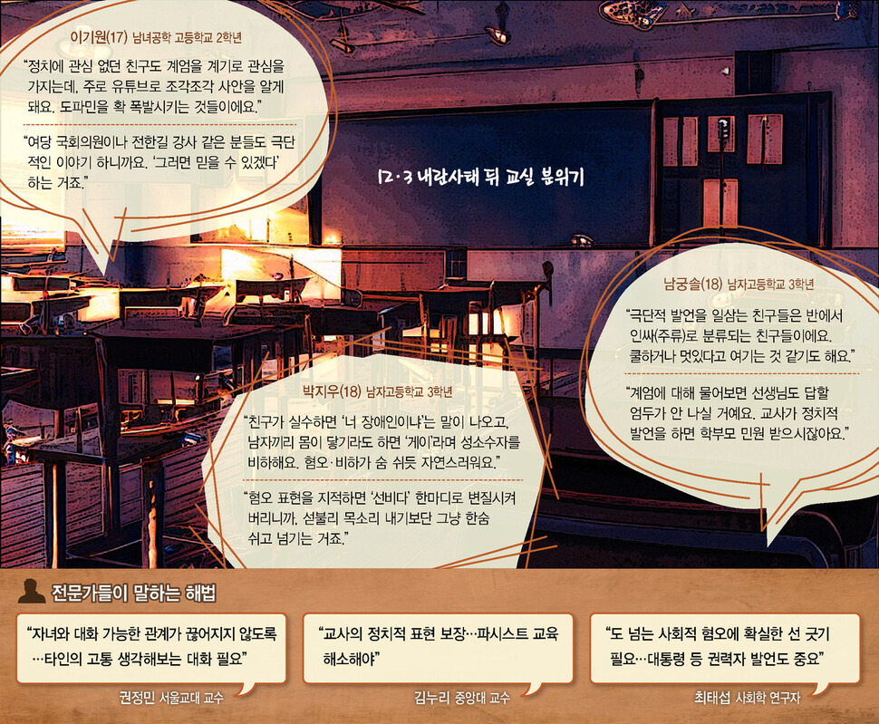 바로잡고 싶었다. 계엄군이 국회에 들이닥친 참담함, 시민 기본권을 침해하는 비상계엄 포고령의 문제점을 차분히 설명해보려 했다. 되돌아온 답변은 그저 사진 몇장. 박정희, 전두환, 탱크의 모습이 휴대전화 화면에 번졌다. 그 대화가 이후 교실을 뒤덮을 극단적 목소리의 서막이리라고, 그날 이군은 생각지 못했다.