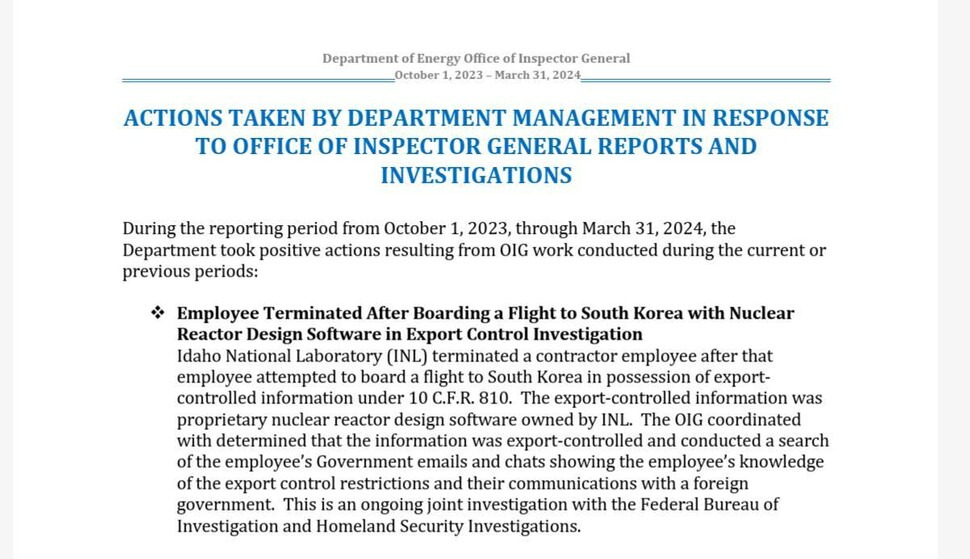미국 에너지부 감사관실이 지난해 상반기 미 의회에 제출한 반기 보고서를 보면, 아이다호 국립연구소(INL)는 수출 통제 조사 과정에서 원자로 설계 소프트웨어를 소지한 채 한국행 비행기에 탑승하려던 계약직 직원을 적발해 해고했다. 에너지부 감사관실은 2023년 10월부터 지난해 3월까지 업무성과를 소개하며, 이 사건을 첫번째 사례로 거론했다.