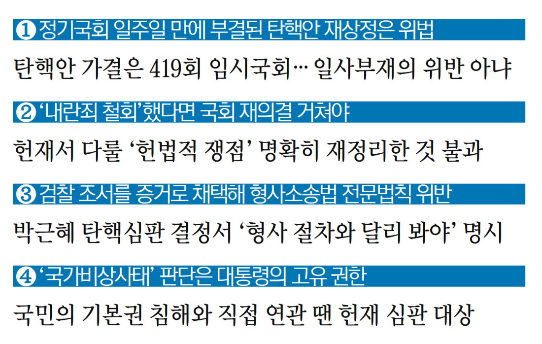 윤 대통령 측도 지난 1월 헌재에 낸 답변서에서 “일사부재의를 위반하지는 않았다고 하더라도 대통령 탄핵의 엄중한 요건과 절차를 규정한 헌법을 위반한 잘못은 부정할 수 없다”고 했다.