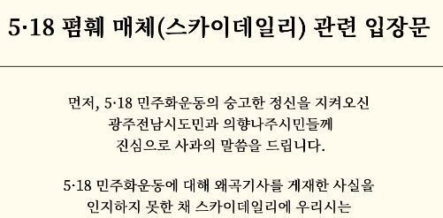 나주시도 누리집에 입장문을 올려 “5·18 왜곡 사실을 인지하지 못했다. 책임을 통감하며 스카이데일리를 즉시 출입 등록 해지하고 광고비 지원도 전면 중단하겠다. 이번 일을 계기로 가짜·왜곡(거짓)뉴스로 역사적 사실이나 민주주의 가치를 왜곡해 나주와 호남인의 자존심을 훼손하는 매체에는 시민의 소중한 예산이 낭비되지 않도록 철저한 관리·감독하겠다”고 약속했다. < 한겨레 김용희 기자 .