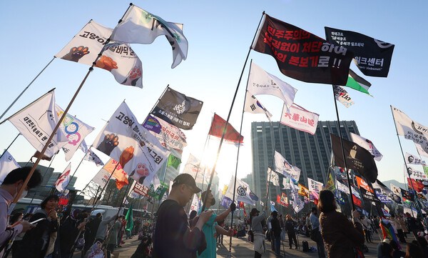 22일 서울 광화문 앞에서 열린 윤석열 즉각퇴진·사회대개혁 16차 범시민대행진에서 다양한 단체 깃발들이 바람이 펄럭이고 있다. 2025.3.22. 연합