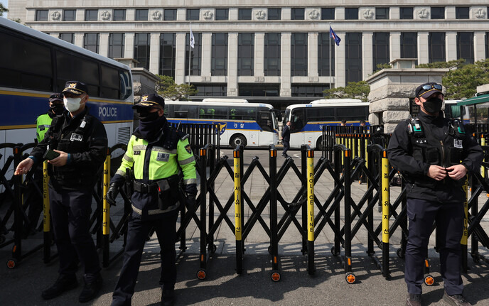 경찰은 선고 당일 헌법재판관의 신변 보호 등을 위해 전담경호대와 형사·경찰특공대를 배치할 예정이라고 밝혔다. < 경향 배시은 강한들 기자 >