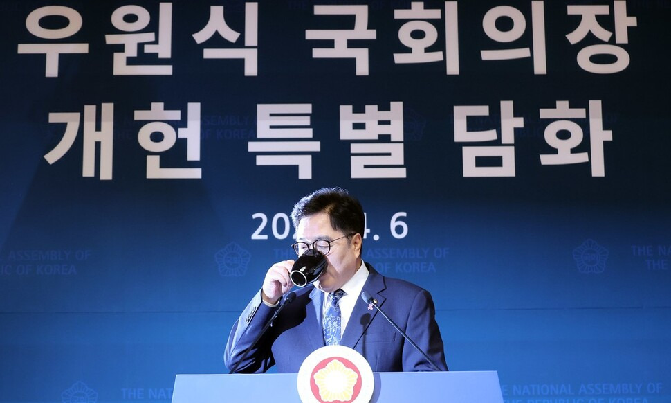야권에서 그의 권력구조 개헌 주장을 ‘내각제 개헌’으로 몰아붙이며 공격이 쏟아진 데 대해서도 유감을 나타냈다. 우 의장은 “어떤 이유로 의장의 개헌 제안이 내각제 개헌으로 규정됐는지는 알 수 없다. 매우 유감스러운 일”이라며 “합리적이고 진지한 토론을 위축시키고 봉쇄하는 선동”이라고 밝혔다. < 한겨게 엄지원 기자 >