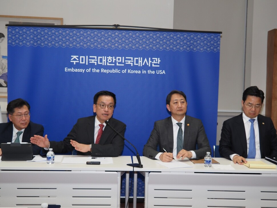 이어 “‘관세·비관세조치’, ‘경제안보’, ‘투자협력’, ‘통화(환율)정책’ 등 4개 분야를 중심으로 논의해 나가는 데에도 한미가 공감대를 형성했다”며 “협의의 출발점인 ‘2+2 회의’를 통해 협의 과제를 좁히고 논의 일정에 대한 공감대를 형성함으로써 협의의 기본틀, 즉 프레임워크를 마련했다”고 강조했다.