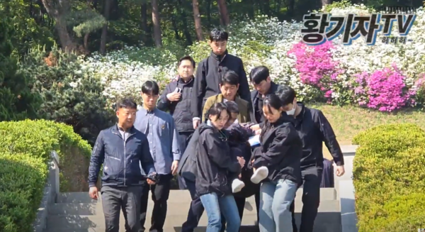한 남성이 민주당 관계자와 경호 인력에게 사지가 붙잡혀서 박정희 전 대통령 묘역에서 나왔다. 남성은 스스로 걸으려고 하지 않아 이후에도 경호 인력을 통해 정자로 이동했다. 2025.04.28. 유튜브 황기자