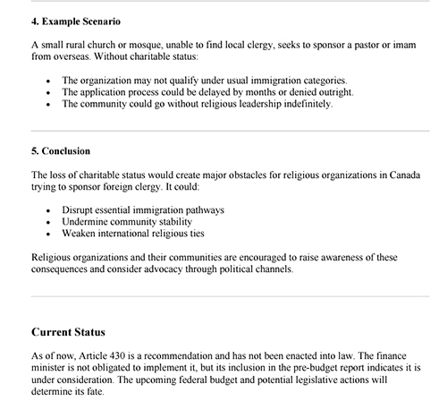 실제로 Recommendation 430이 채택돼 법으로 시행되면 캐나다 전역의 종교 단체, 특히 교회들은 '자선 단체(Charity)' 지위를 상실하게 된다. 현재 등록된 약7만3천개의 캐나다 자선단체 중 42%인 약 3만개가 교회, 회당, 모스크, 사찰 등 신앙 기반 단체들인데, '종교의 증진'이 자선 목적으로 인정되지 않으면, 이들 대부분이 자선 단체 지위를 박탈당해 더 이상 소득세, 상품 및 서비스세(GST) 및 통합 판매세(HST) 면세 혜택을 받지 못하고 과세 대상이 될 수 있다.