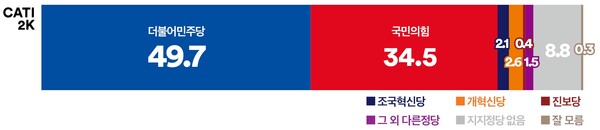 정당지지도 조사에서 ‘더불어민주당’의 지지율은 지난 조사 대비 1.7%p 상승한 49.7%로 나타났다. ‘국민의힘’은 3.2%p 상승한 34.5%를 기록하며 상승세를 이어갔다. ‘더불어민주당’과 ‘국민의힘’ 간 지지율 격차는 15.2%p였으며, ‘더불어민주당’과 ‘조국혁신당’의 합산 지지율은 51.8%로 ‘국민의힘’(34.5%)보다 17.3%p 앞섰다.