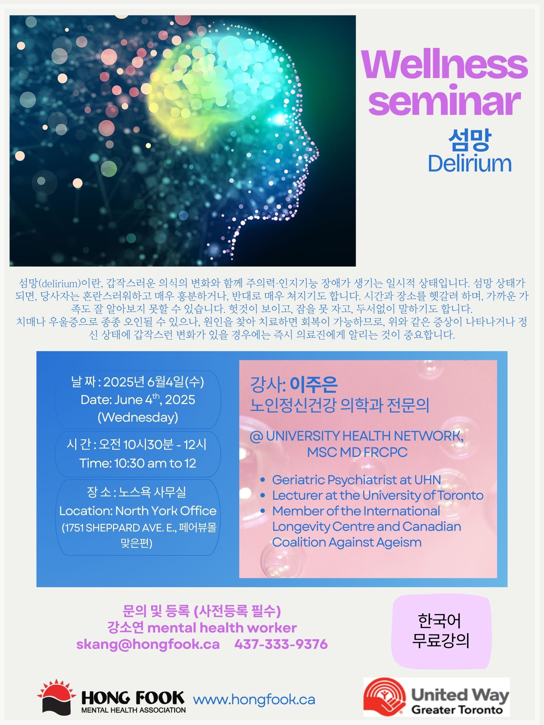 홍푹정신건강협회는 오는 6월4일(수) 오전 10시30분부터 12시까지 ‘섬망’(Delirium)을 주제로 정신건강 세미나를 연다.