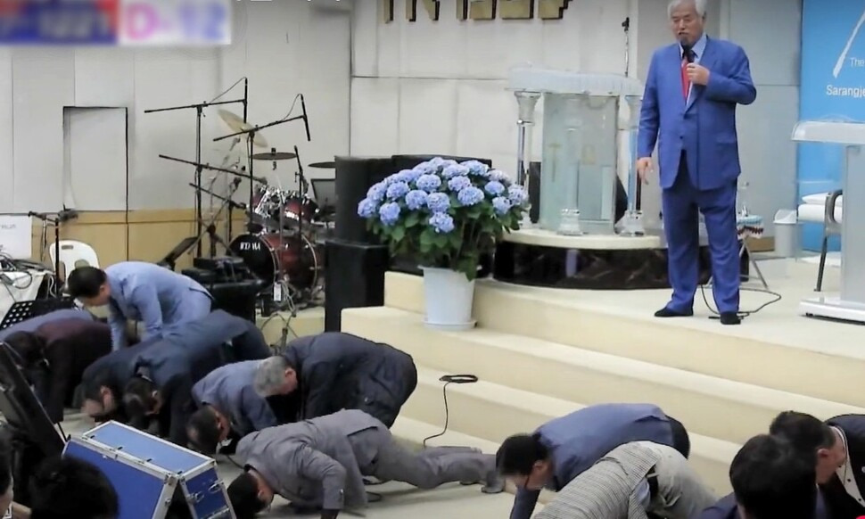 25일 전 목사가 운영하는 유튜브 채널 ‘전광훈 티브이(TV)’를 보면, 그는 지난 22일 사랑제일교회에서 각 지역 광역위원장들을 앞에 나오게 한 뒤 “(집회 참여자를) 100% 다 데려온 사람은 들어가고, 나머지는 좌우로 정렬. 대가리를 박는다, 실시!”라고 말했다. 전 목사의 시지에 따라 앞에 나온 교인 10여명은 ‘엎드려뻗쳐’를 하며 두 손을 뒷짐을 졌다.