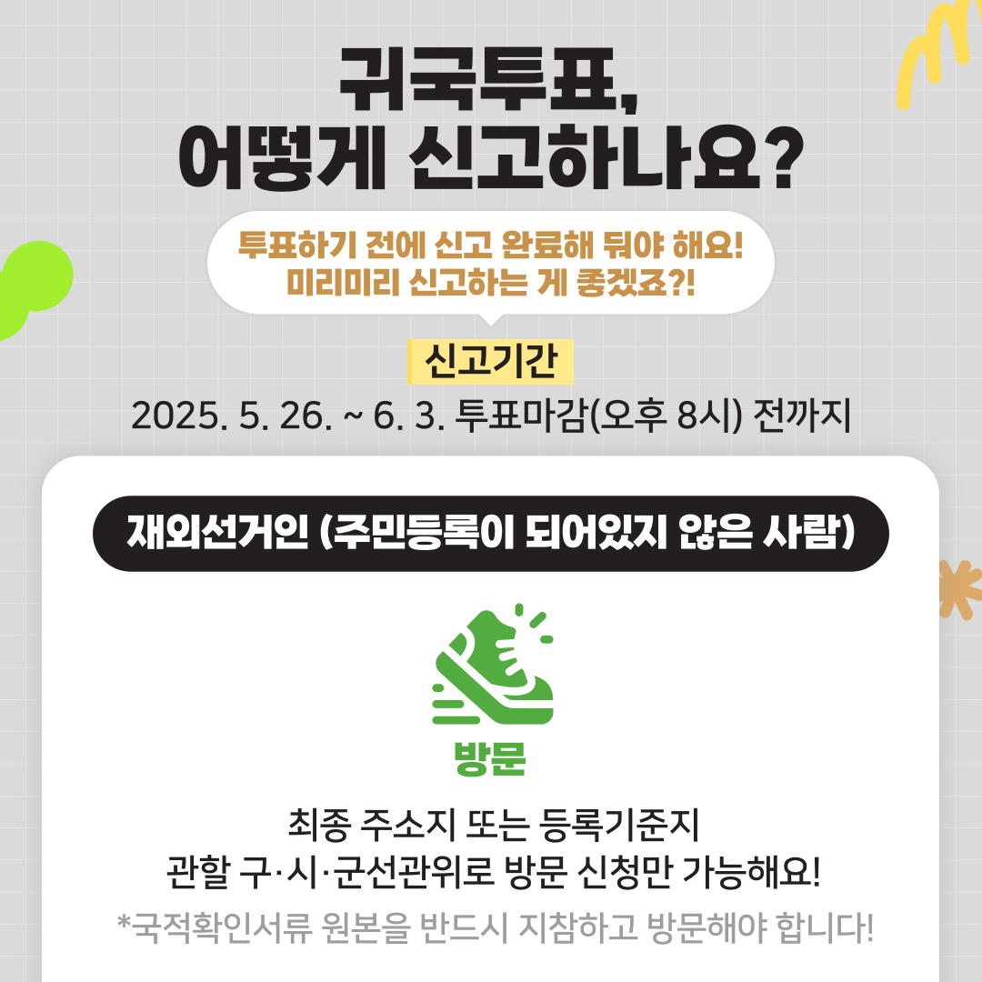 재외투표를 하지 않고 귀국한 재외선거인은 선거일까지 주소지 관할 구·시·군 선관위에 신고하면 투표할 수 있다. < 문의: 416-920-3809 >