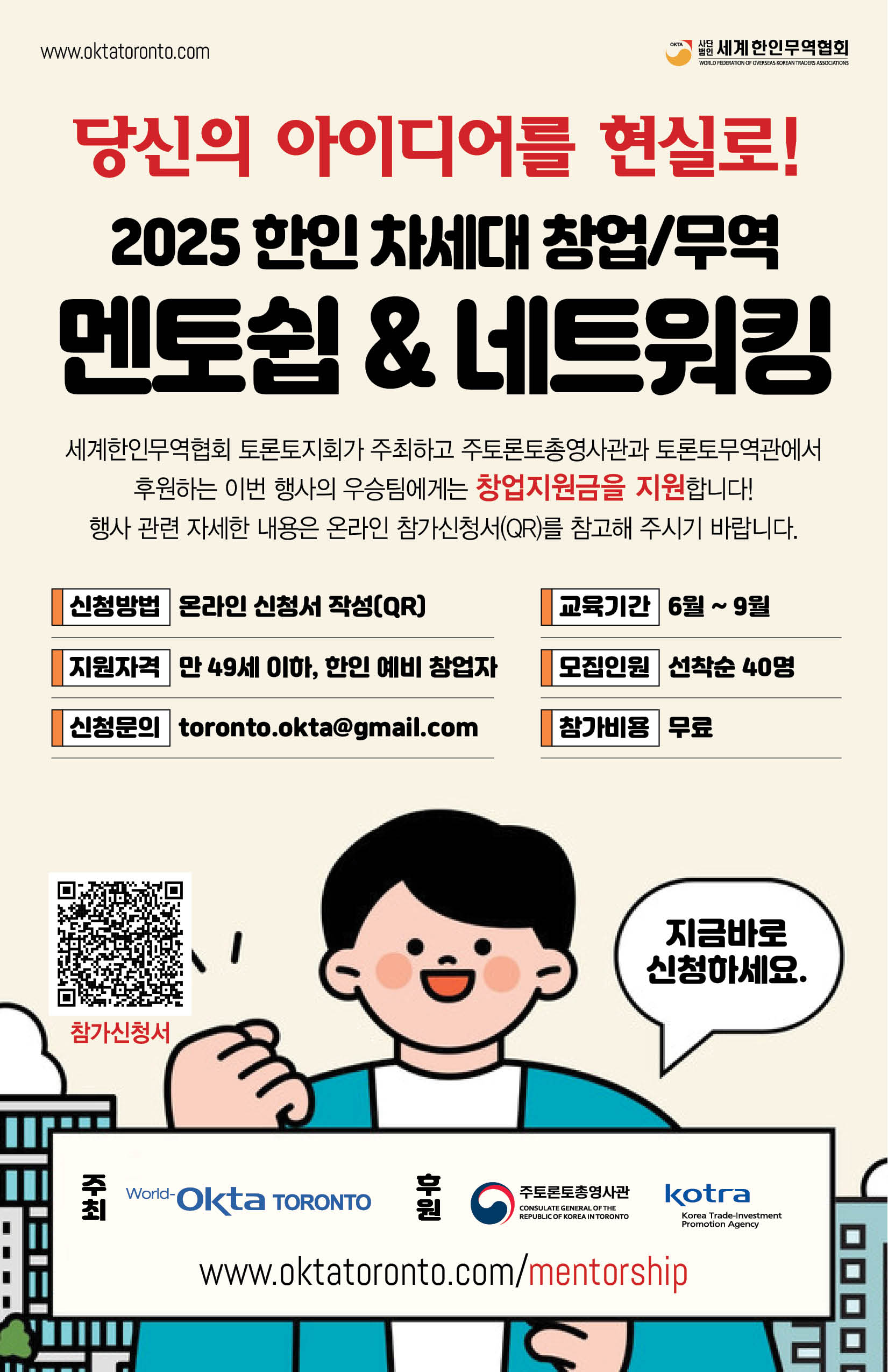 세계한인무역협회 토론토지회(OKTA: 지회장 이민호)는 오는 6월부터 4개월간 20~40대 한인 차세대가 참여하는 ‘2025 한인 차세대 창업/무역 멘토십 & 네트워킹’행사를 갖는다며 지원자를 모집한다고 밝혔다.