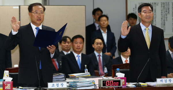 2014년 10월 21일 대구고등검찰청에서 열린 국회 법제사법위의 대구고등·지방검찰청에 대한 국정감사에서 박성재 대구고검장(왼쪽)과 오광수 대구지검장이 선서하고 있다. 2014.10.21. 연합