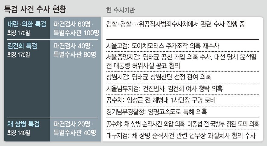 특별검사는 민주당과, 비교섭단체 가운데 의석수가 가장 많은 조국혁신당이 각각 1명씩 후보자를 추천하고, 이 가운데 1명을 이재명 대통령이 임명한다. 특검보는 특검이 4명을 추천해 이 대통령이 임명한다. 파견 검사는 40명, 특별수사관과 파견 공무원은 각각 80명이고, 수사 기간은 준비 기간(20일)을 빼면 최장 150일이다. < 김해정 기자 >